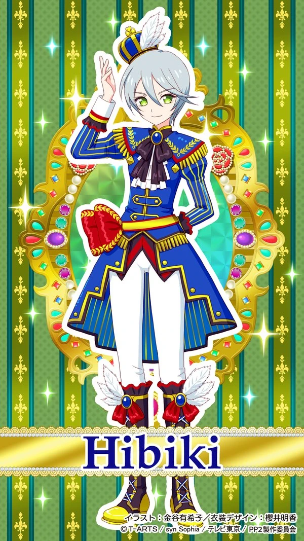 Here's Hibiki. Standing in a spotlight on a stage. Chandeliers hang twinkling from the ceiling. She's dressed to impress in full prince splendor.
